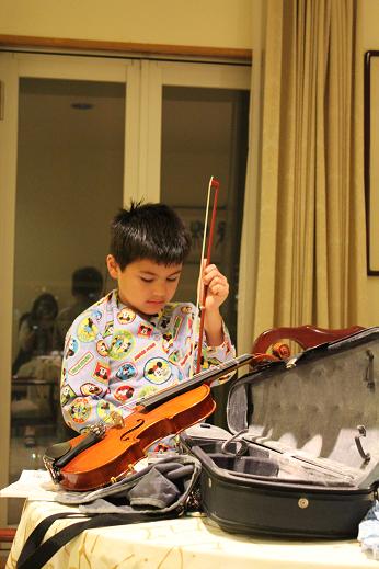 さっそく新しく毛換えした弓にワックスを塗る小陸。なんだか頼もしいでしょ。いかにも弾けそうな・・・。