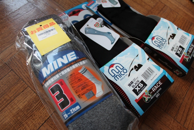 左側は老陸用のスキーソックス、3足998円、お買得品です(笑)。そして右側が小陸用のスキーソックス、一足2500円!この格差は何(笑)?いつも行く石井スポーツさんで、「今月、初めて大会出るんですよ~」って言ったらすすめられたんだよね。レーシング用のソックス、0.5センチ単位ですよ。かたや老陸のは25~27センチっていうざっくりさ。小陸、レーシング用のスーツはお下がりもらったからいいんだけどその下に着る下着も買おうと思ったら6000円くらいするの。さすがにそこまではね~。ユニクロのヒートテックでいいよね。
