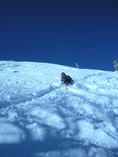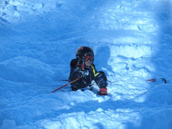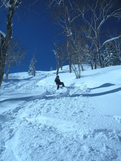 小陸は調子よく滑って・・・最後はクラ~ッシュ!新雪のパウダースノーってもがけばもがくほど沈んでって動けなくなるんだよね~。