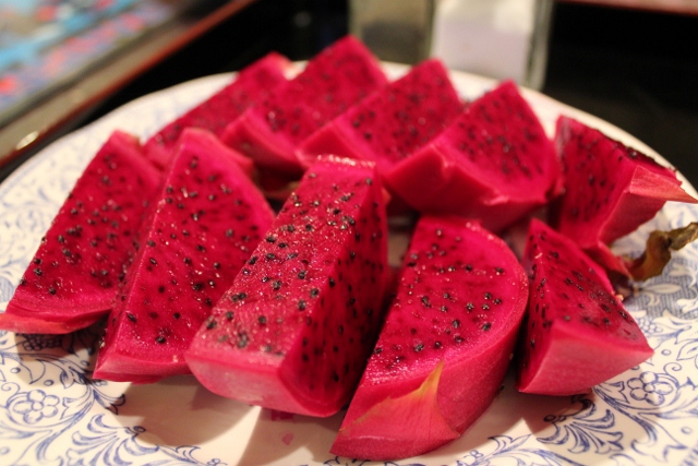 このドラゴンフルーツ、私も赤いのは初めて。ただ単に赤い種類ってことらしいよ。さくっとおいしかったわ。