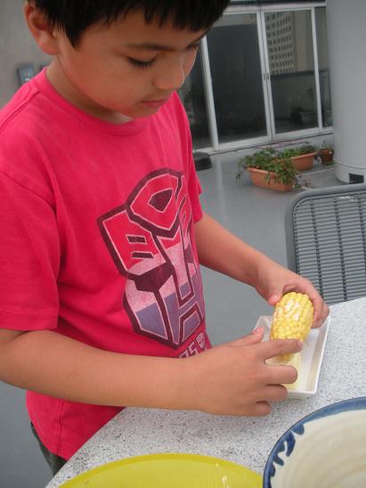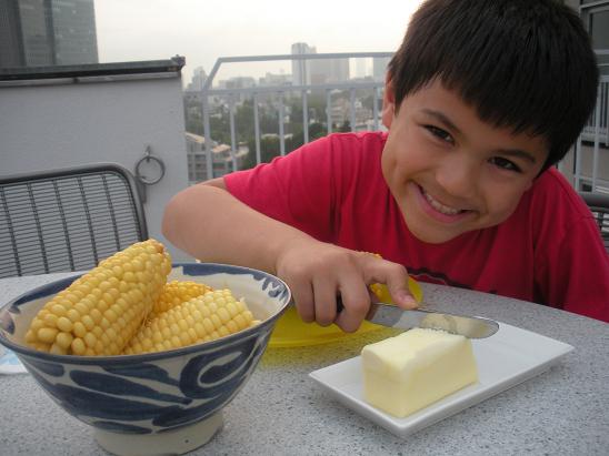 おいおい、それあんた専用のバターじゃないってば!器用にコーンをくるくるっとまわしてまんべんなくバターをつけてますけど。