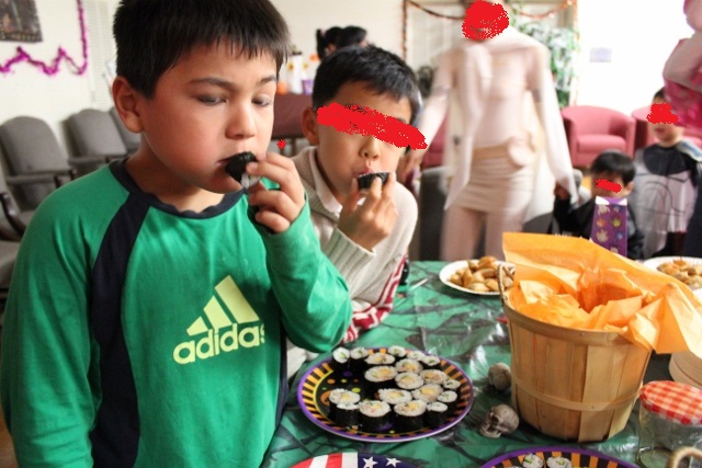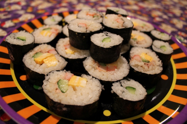 確かこのパーティではハロウイーンのお菓子とかのコンペティションがあったはず。ま、その中にすしロールが混ざっててもいいよね。