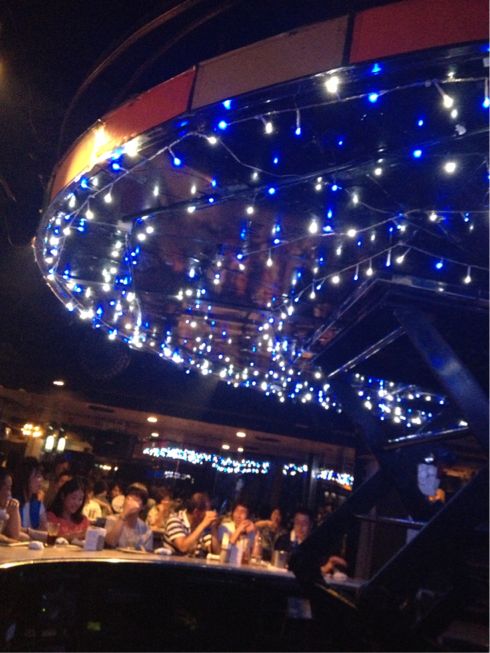 「黒鳥の湖」っていうショーパブ。店内満員ですよ。40分ほどのショータイム、9人のニューハーフ、女装家(?)、女性ダンサーが次々とダンスショーを披露。客席も巻き込んで大盛り上がり。Ms,てびちもはりせんで頭たたかれちゃったよ。最後にお誕生日月のひとや送別会や記念日の人たちはステージでダンサー達と写真がとれます。私達マダム3人もお誕生日が二人いたので3人ではいチーズ!いい記念になりました~。9人のうち誰がニューハーフかなどど考えて見るのも楽しかったですけど、いやいや重労働だよ、あれ。