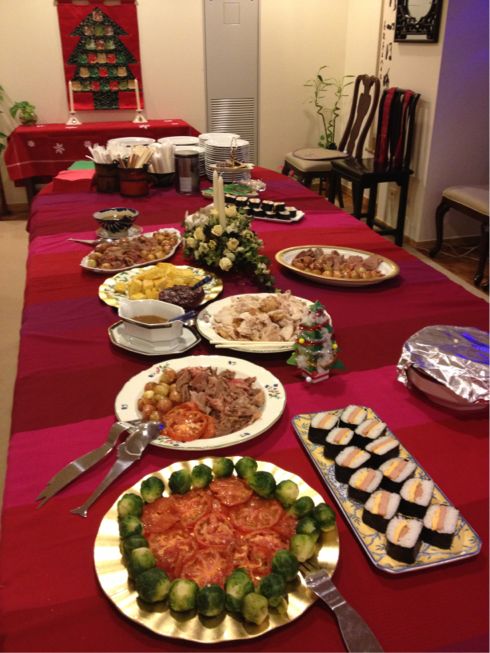 毎年恒例のクリスマスパーティはメインとドリンクをうちが出し、参加者はサイドディッシュを持ってくるとい言うポットラック形式。