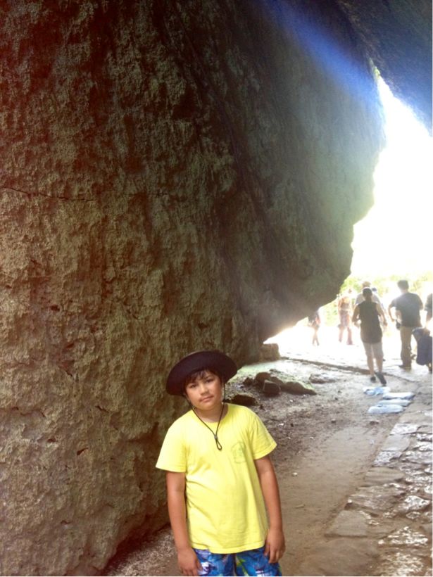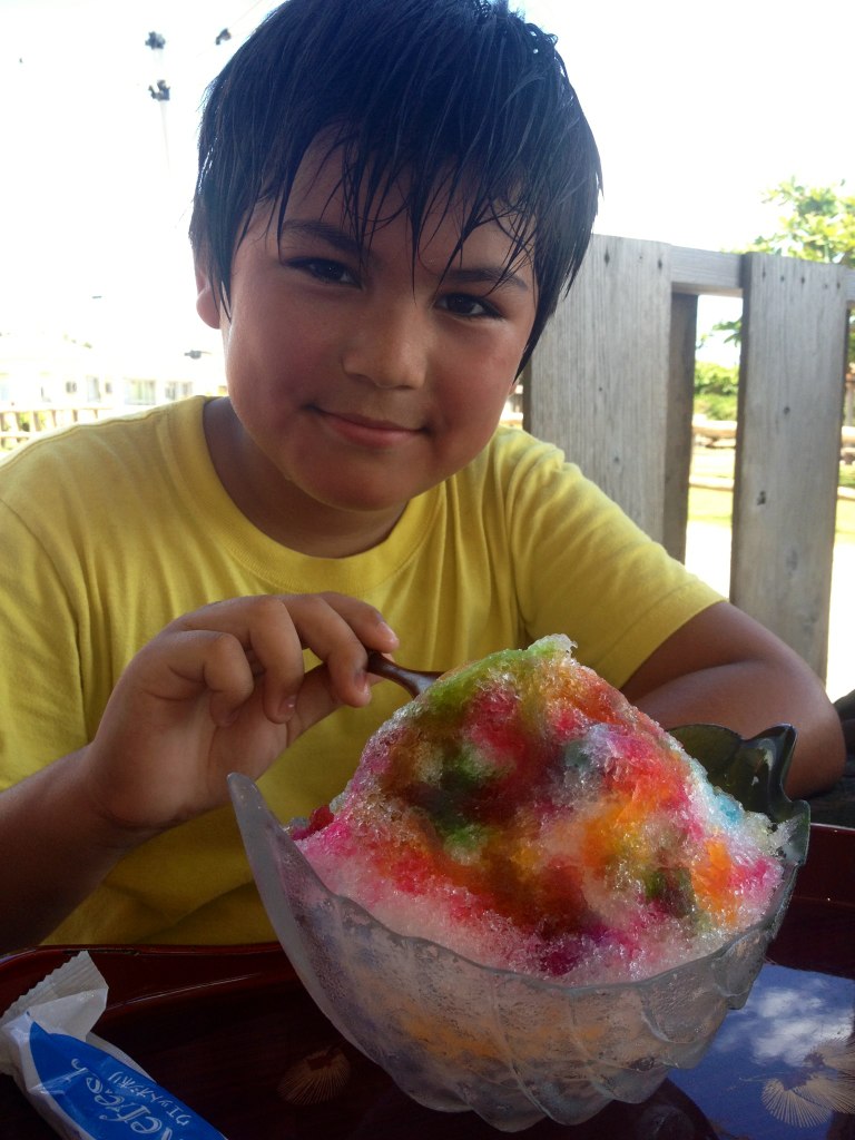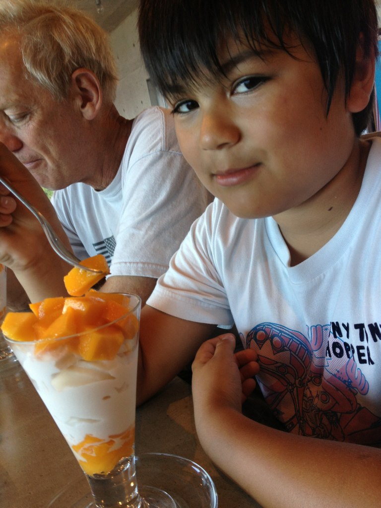 ここまで来たらやっぱりここだよね!小陸のどや顔。「ブリリアンテモトブヒルズ」のマンゴーパフェ。これも食べ収め~(号泣)・・・。