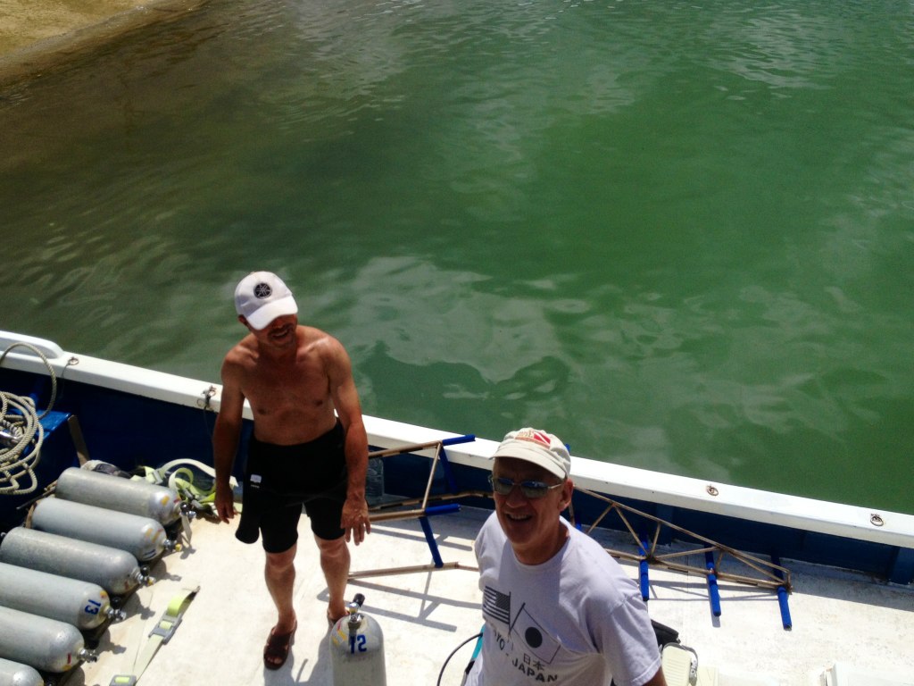 フリーのダイビングツアーガイド、梶原さん。ちょっと世捨て人のようなかたですがいい人です。故三笠宮殿下を海の底に案内したこともあるのですよ、こう見えて。一週間前に来沖の夫の上司にも電話番号教えたら、何回も東京のさる筋から電話があって「俺、なんかアメリカに悪いことしたんかな~」ってびびってたそう。ごめんね、梶原さん。結局上司はビギナーダイバー満載のエリアに行ったそう。