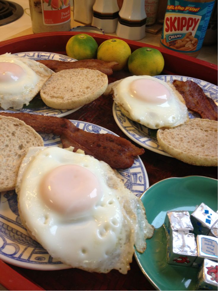 朝はイングリッシュマフィンに目玉焼き、ベーコン、みかん、チーズ。こんなもんでいいでしょ。
