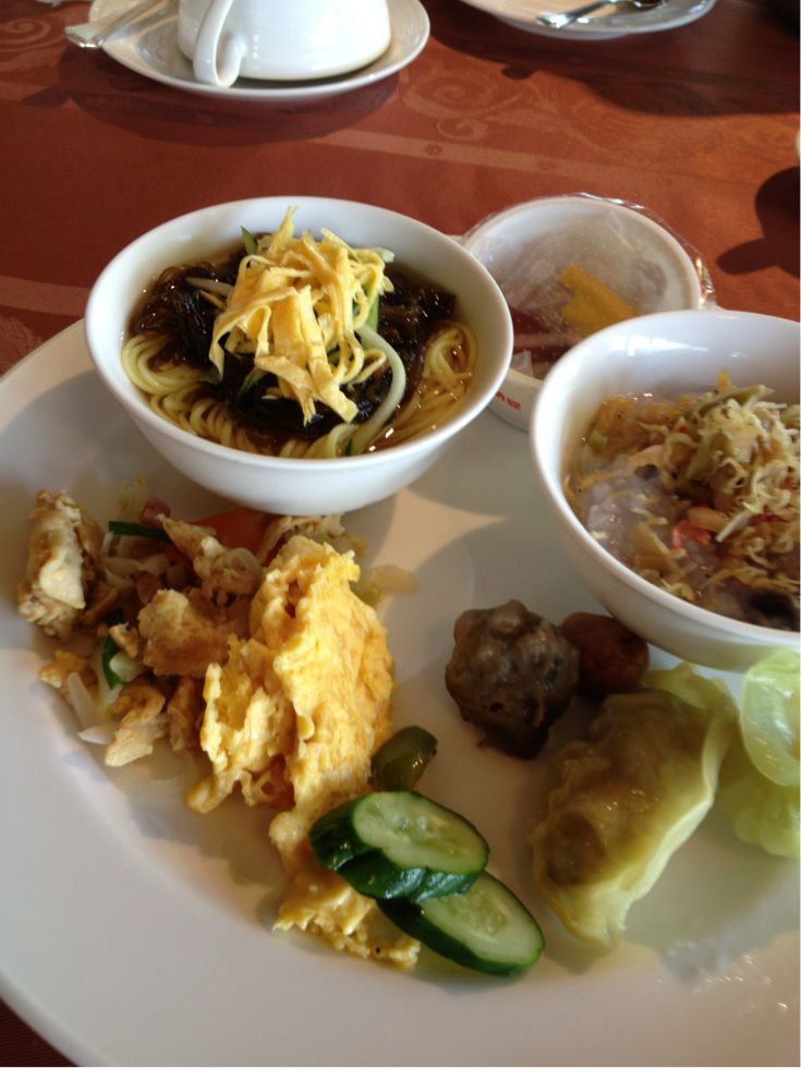 朝からこんなに食べました。うこんの麺に大好きなもずくをのせて。
