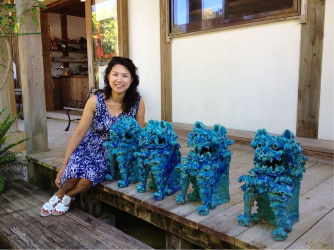 窯入れ前であまりものがなく残念。でも軒先には先生のトレードマーク、ブルーのシーサーが鎮座していたので一緒に記念写真。