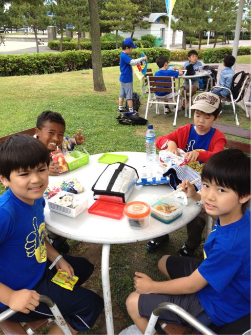 着いてすぐにイルカショーを見てその後は水族館をスルー。え?でしょ。即行で乗り物に乗りに行った私たちのグループです。で、あっという間にランチの時間。どれどれ~みんなどんなお弁当かな。私は5時半起きでサラダ巻き作ったもんね~。って思ったらなんとあと二人すしを持ってきた子がいました。一人は韓国人でキムパッ、もうひとりは何とインド人の子でした。