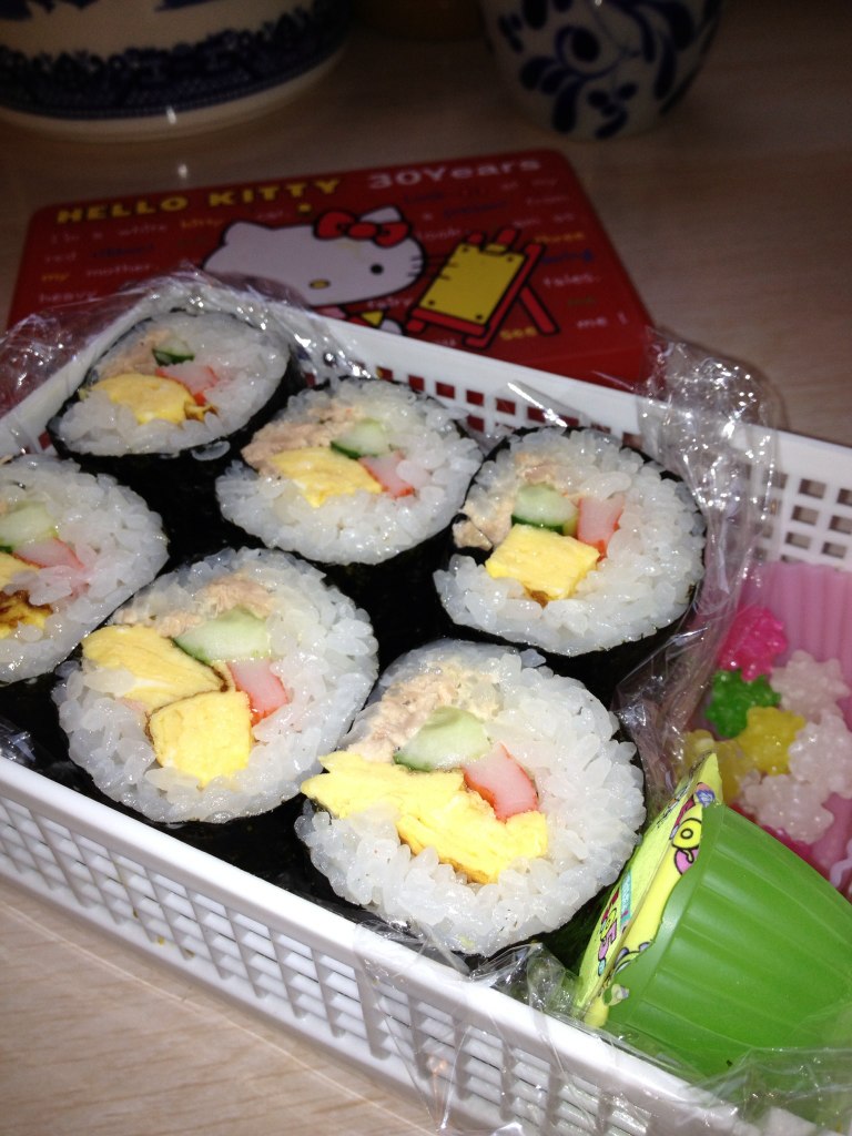 私の自信作。サラダ巻きのときはいつもこのキティーちゃんのやつに入れてあげます(嫌がらせ?)。横には大阪のおばからもらった金平糖とゼリー。ほんとはここにエダマ~ミ~でも入れてあげればよかったんですが…時間切れ。もういいよ!充分やろ!